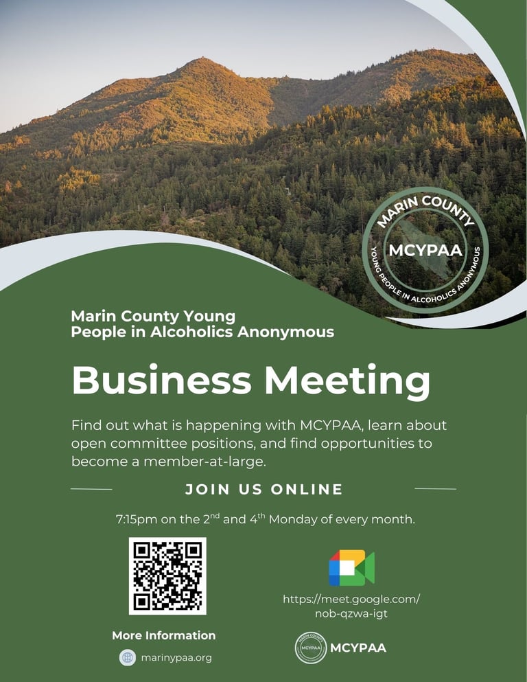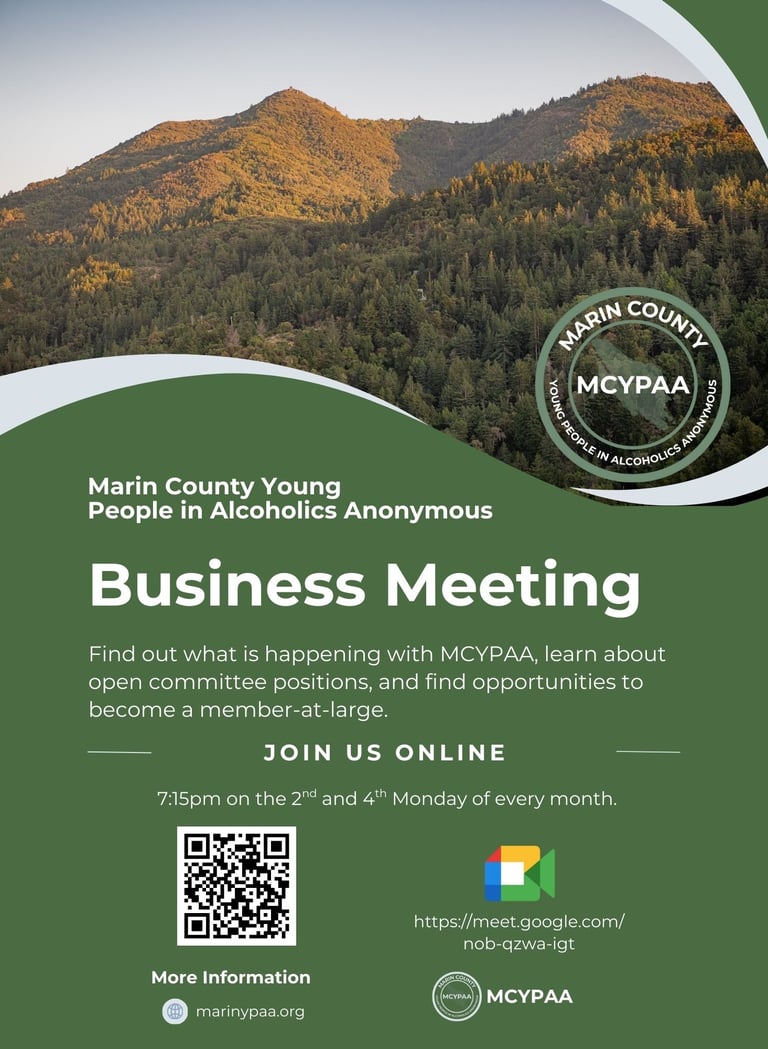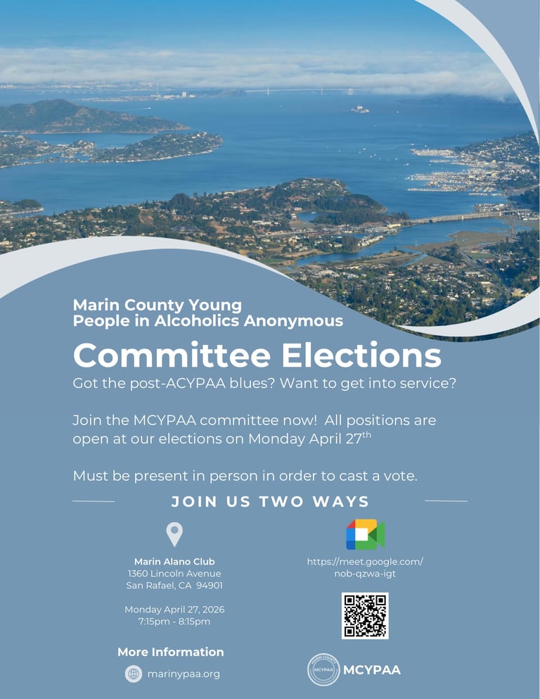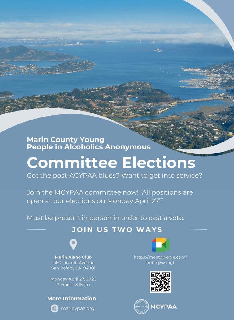 All committee positions are up for grabs! Want to get into service? Want to help young alcoholics in Marin? Want to help host cool sober events? Come and join us in person and take a position!