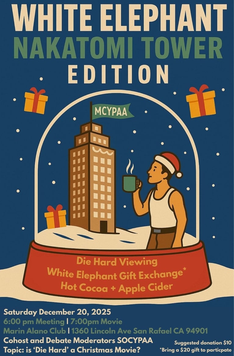 Join us at the Marin Alano Club for a 'Die Hard' watch party and an optional White Elephant gift exchange. If you would like to participate in the gift exchange, bring a gift no more than $20.